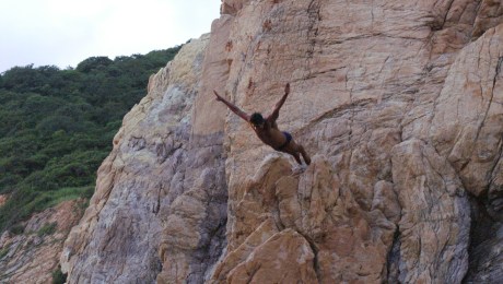 A diver leaps into the void, arms outstretched, from a steep rocky cliff overlooking the ocean. Tourists hold their breath. August 2007 Un plongeur s’élance dans le vide, bras déployés, depuis une paroi rocheuse abrupte dominant l’océan. Les touristes retiennent leur souffle. Août 2007.