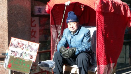 A man bundled up in a padded jacket and a beanie sits in a rickshaw covered with a red tarp, bathed in winter light. He offers rides through the historic center of Beijing. December 2004. Un homme emmitouflé dans une doudoune et un bonnet est assis dans un pousse-pousse recouvert d’une bâche rouge, baigné par…