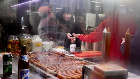 In the evening, even late at night, kiosks selling several varieties of sausages are open. Viennese people crowd around them to enjoy a sausage with mustard in a bread roll. December 2025. Le soir, même tard, des kiosques qui vendent plusieurs variétés de saucisses sont ouverts. Les Viennois s’y pressent pour déguster une saucisse avec…