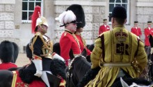 Trooping the Colour is an annual ceremony for the official birthday of the British Queen. The royal procession with the Household Cavalry enters the yard at Whitehall where the Queen will soon inspect her troops. June 2013. Trooping the Colour est une cérémonie annuelle pour l’anniversaire de la Reine d’Angleterre. Le cortège royal avec la…