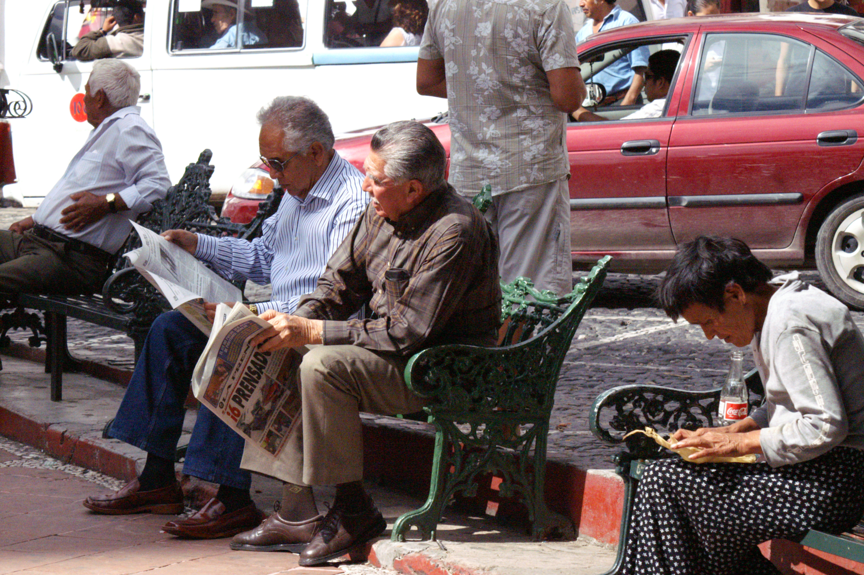 These men are sitting on a bench in front of the Santa Prisca church in Taxco and do not seem to mind the traffic in the street. The city is heavily associated with silver mining. August 2007.