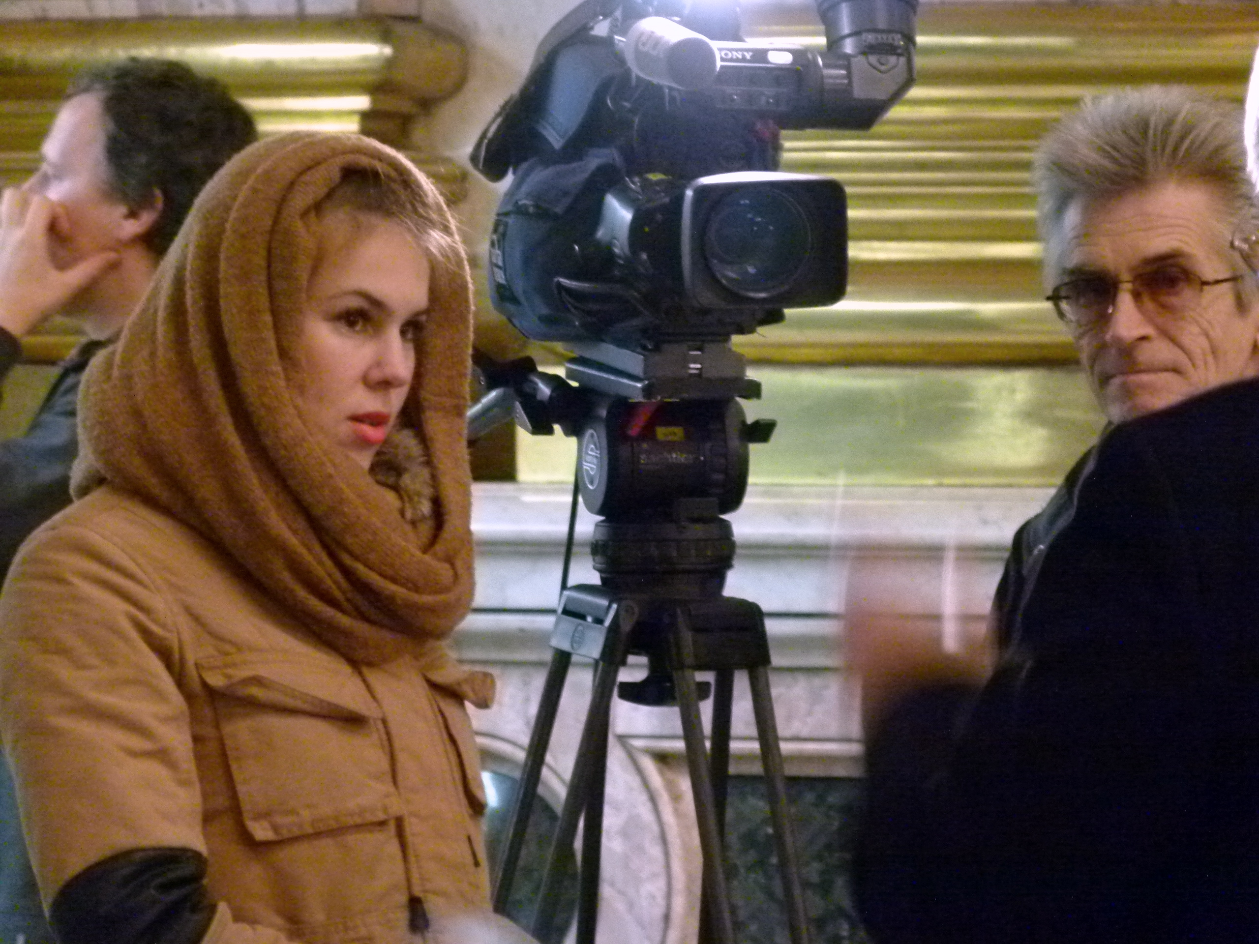 The blond journalist is interviewing an old art historian inside the newly renovated Saint Isaac’s cathedral. It is cold inside. December 2013.