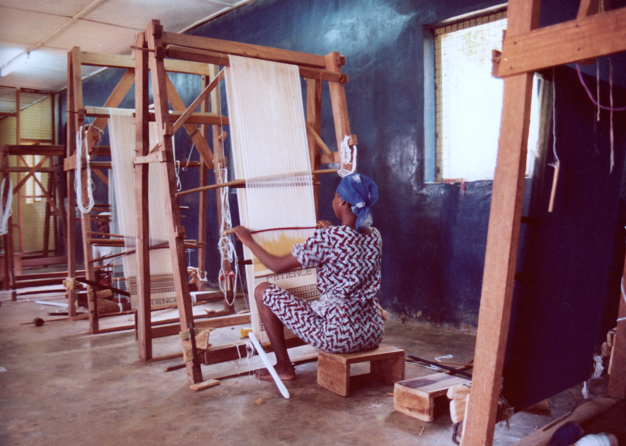 Cloth weaving is a long time tradition in the Okene area as it is passed down from generation to generation. I read that this weaving center had been shut down due to poor management. The local government has now established a training center to teach women how to weave from their home. February 1990.