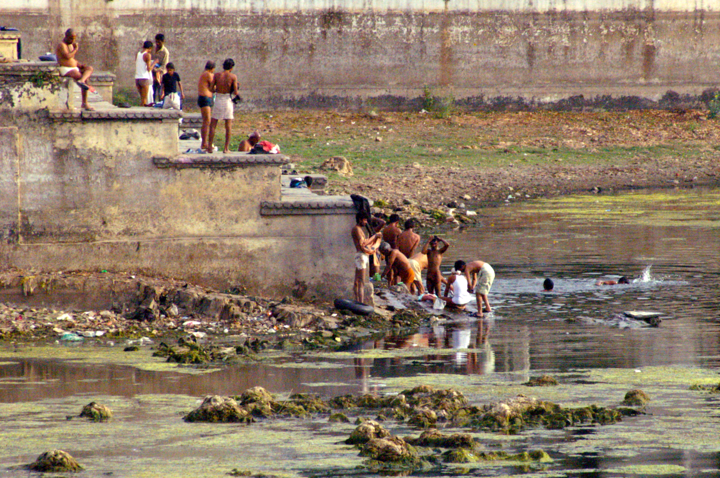 In the early morning, men gather on the banks on lake Pichola to get washed. They do not seem to mind the green moss and the garbage. March 2008.