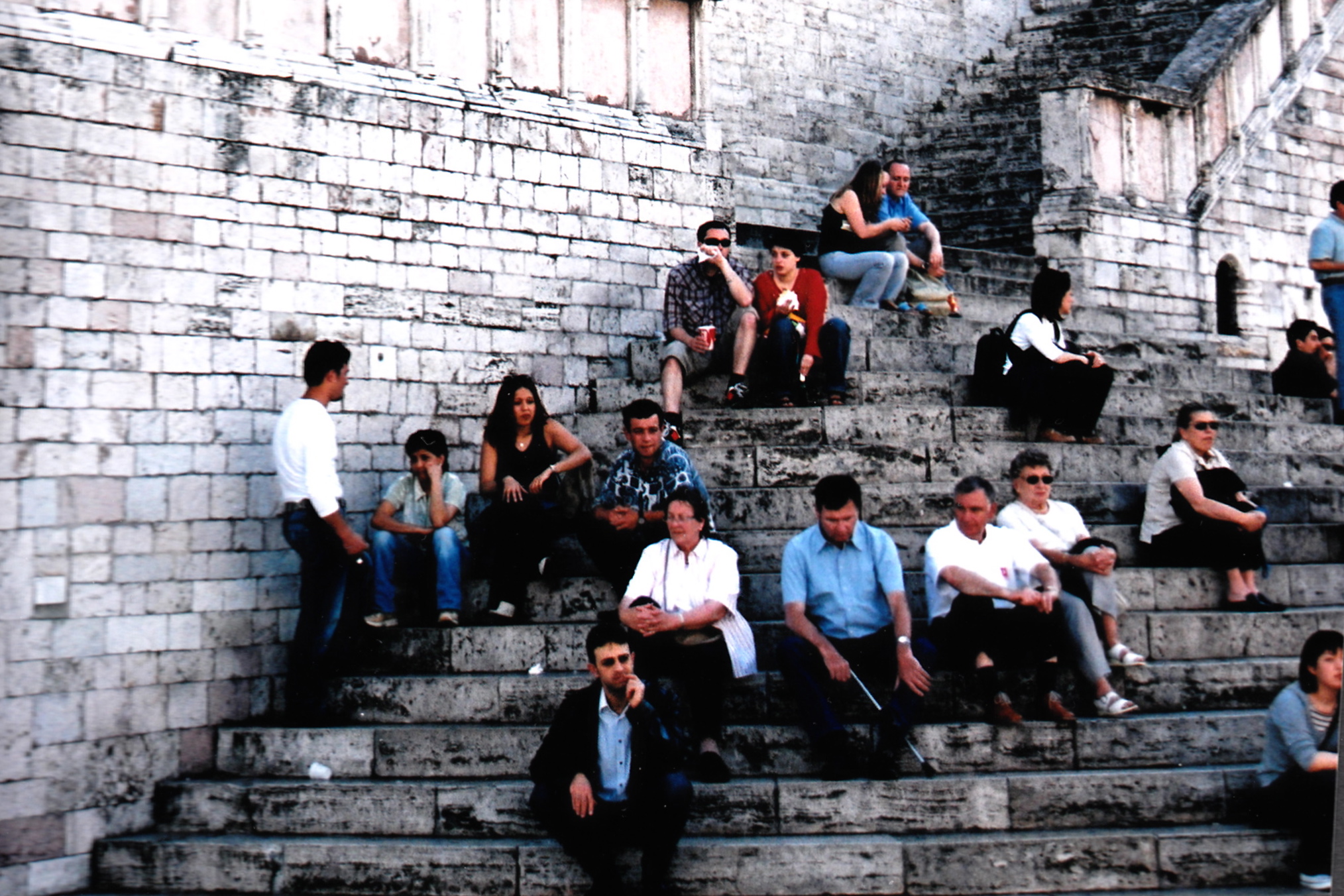 Designs for the Palazzo dei Priori in Perugia date back as far as the 1270s. Students and tourists like to sit on the stairs in Piazza IV Novembre that lead to a gothic portal surmounted by the city’s symbols, the griffin and lion. May 2003.