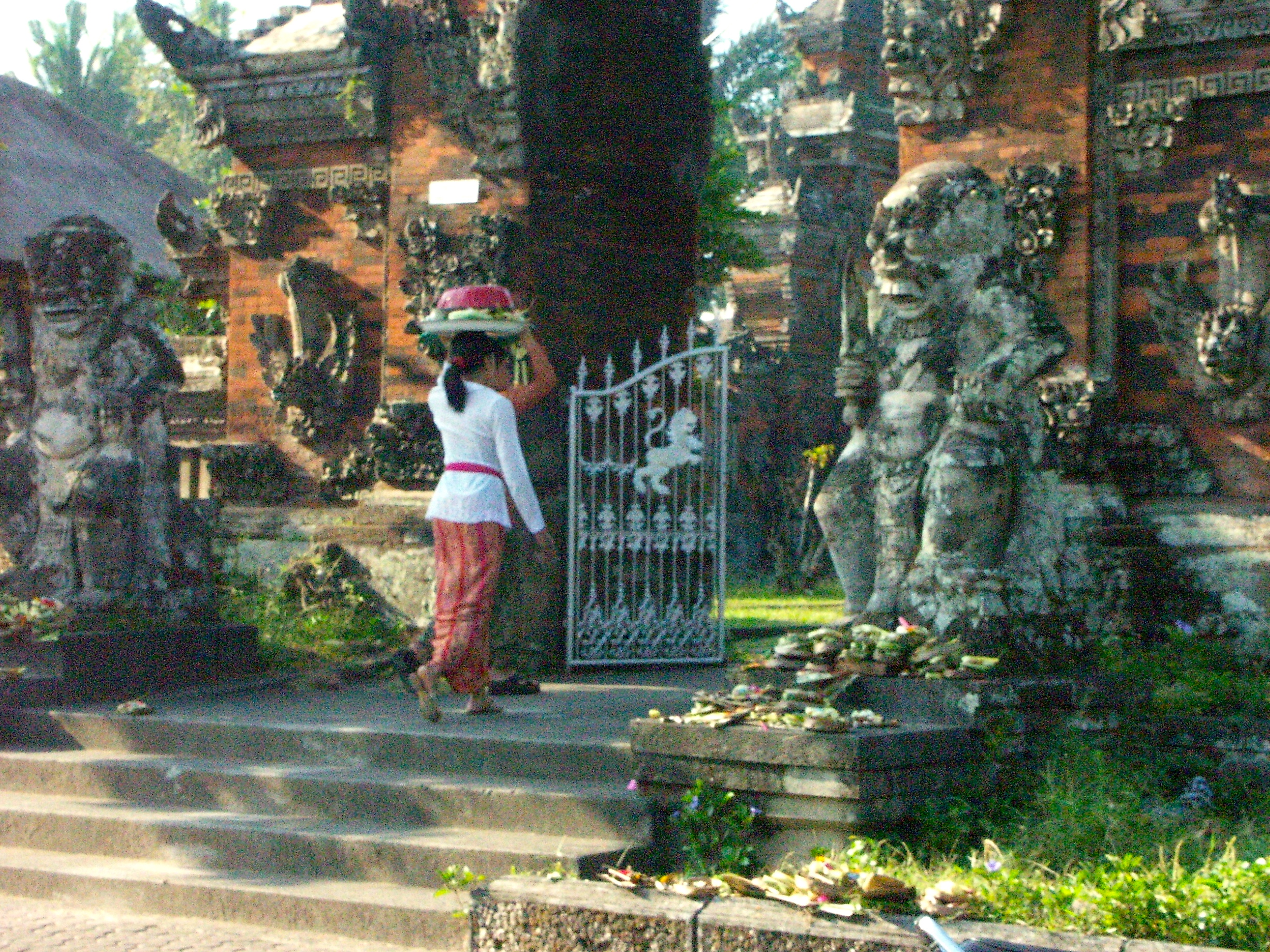 A Bali, j’ai été étonné par l’abondance d’offrandes. Les offrandes doivent apporter du plaisir aux dieux (ou aux démons). Elles assurent aussi un bon karma à ceux qui les préparent. Presque chaque village a sa propre forme d’offrandes. Certains Balinais passent leur vie à en confectionner. Août 2004.