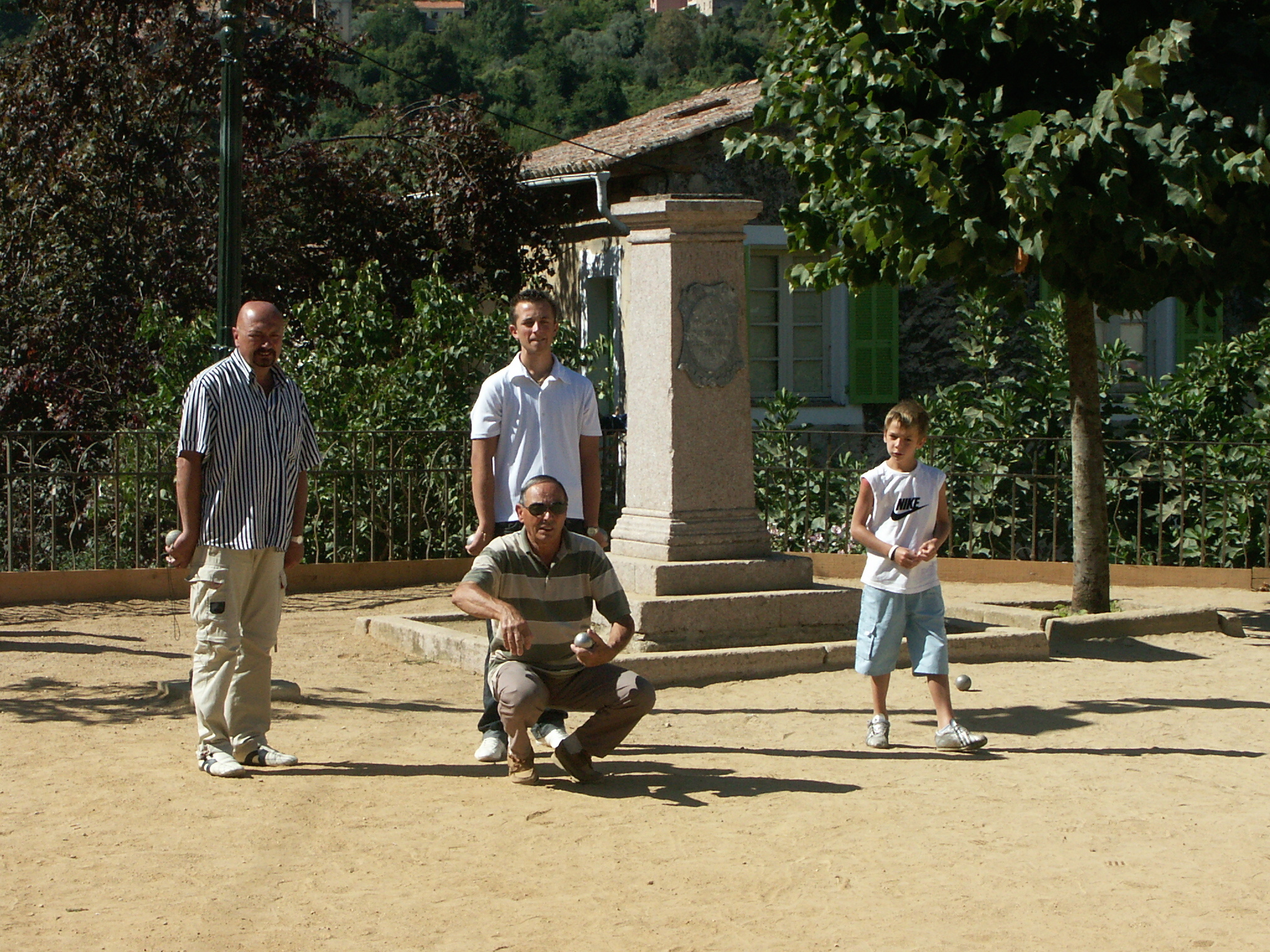 Dans le sud de la France et en Corse, les hommes aiment jouer à la pétanque. La pétanque est un jeu dont l’objectif est de lancer des boules de métal aussi près que possible d’une petite boule de bois appelée un cochonnet. Août 2005.