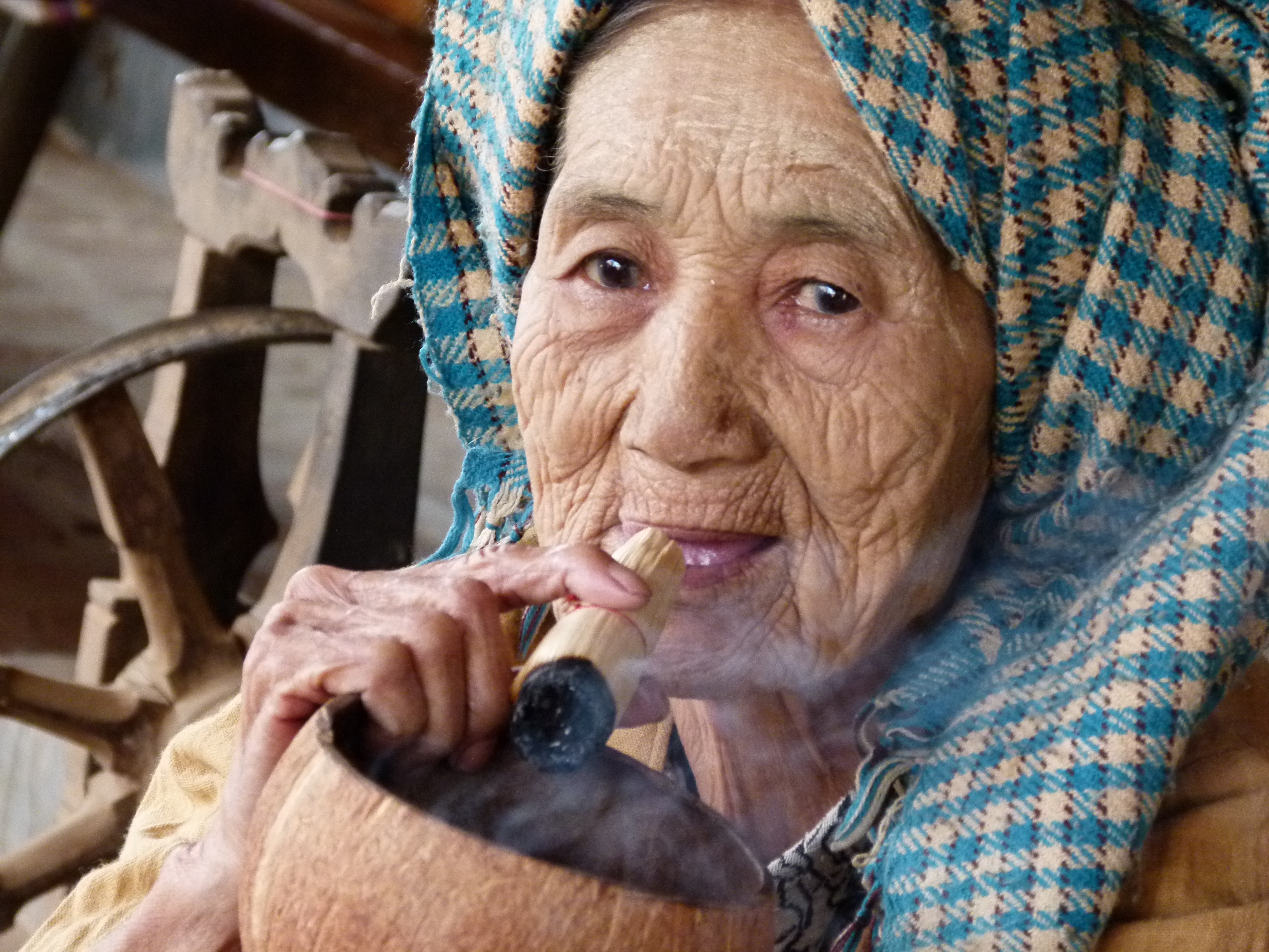 Small green cigars known as cheroots remain more frequent in Myanmar than classic cigarettes. This lady (born in 1925) whom I met in a village near Old Bagan, seems to enjoy smoking one of them. February 2015.