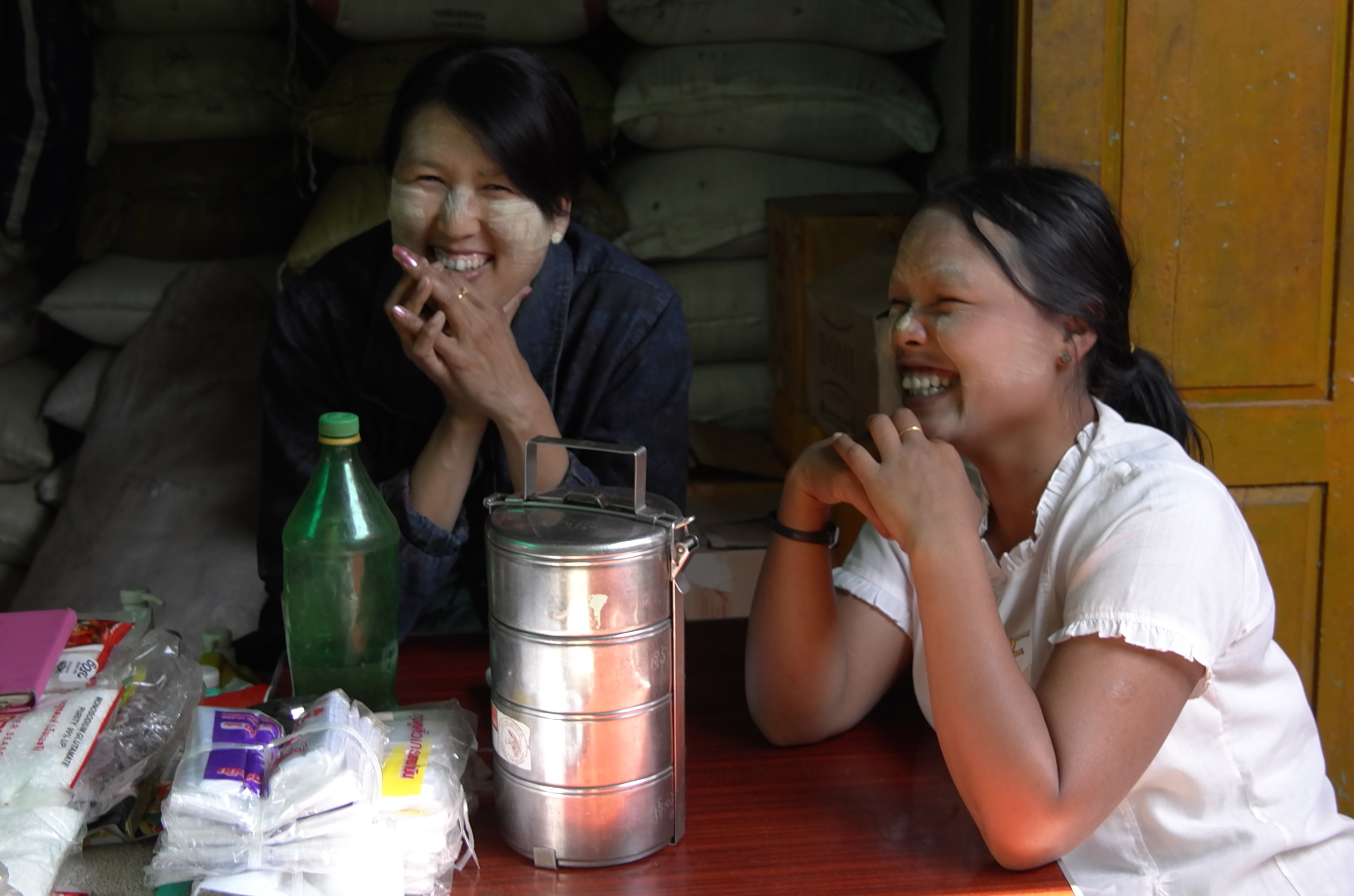 These two smiling market stall keepers I met in Pindaya wear thanaka makeup. Thanaka is a yellowish-white cosmetic paste made from ground bark. Most Burmese women wear it but it is not uncommon to see it on young boys as well. February 2015.