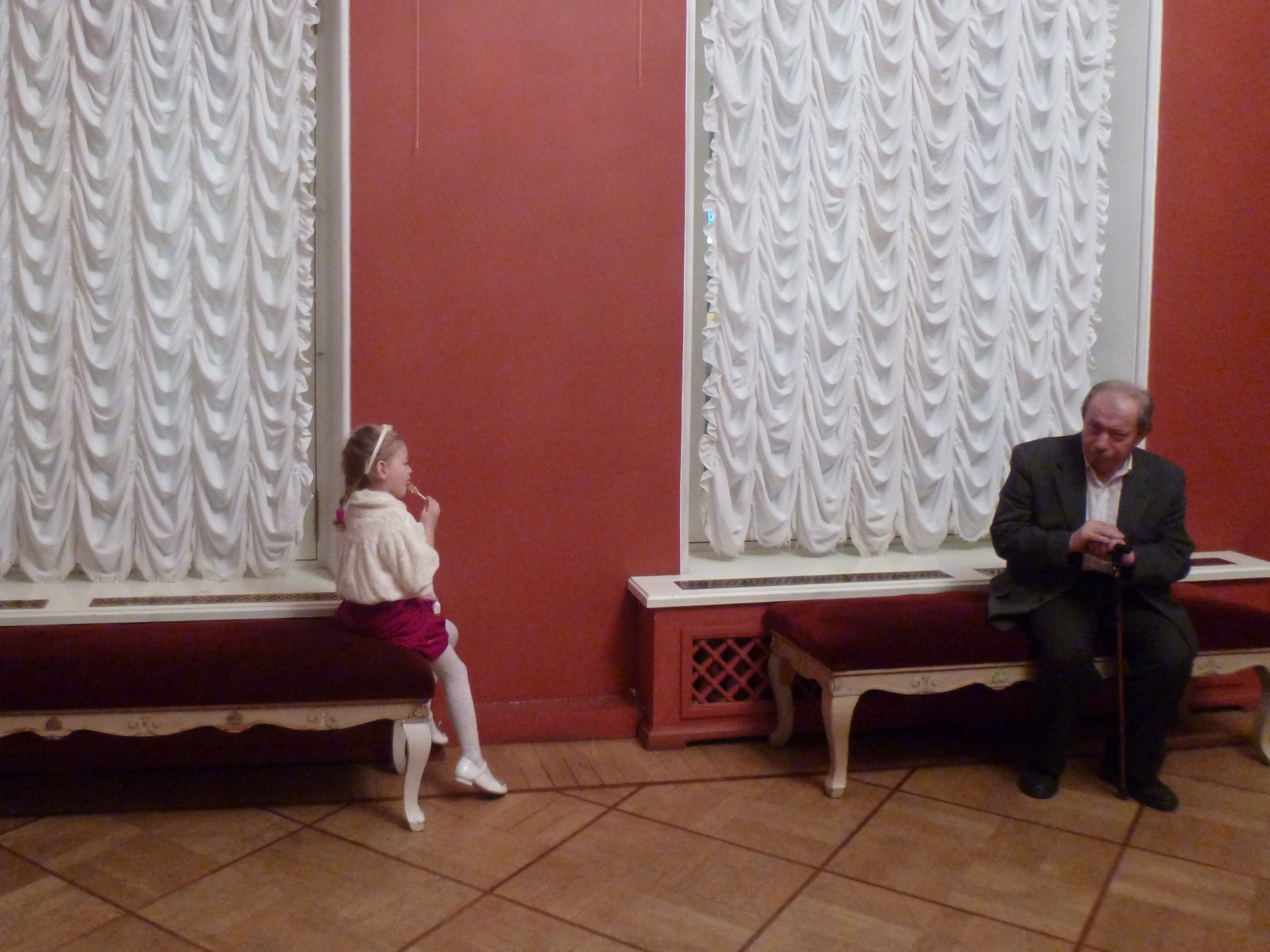 Festoon curtains, a girl with a lollipop and a man with a walking cane: this whole scene in the Small Philharmonic Hall had a 1950’s flavor. December 2013.