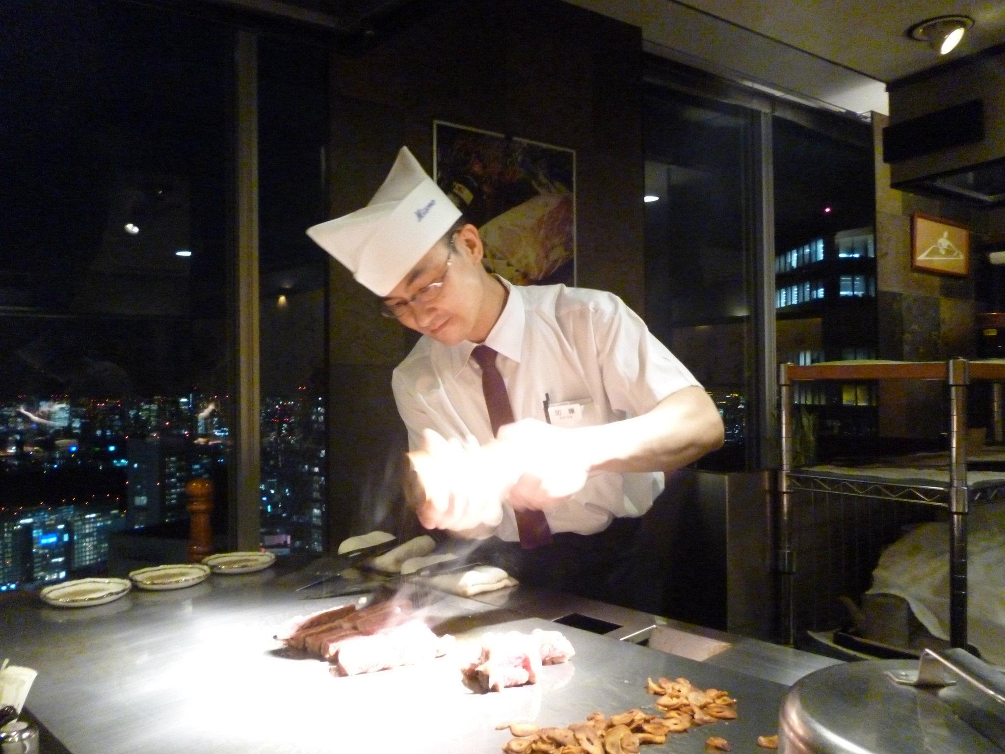 In Japanese, Teppan Yaki literally means « grilled on an iron plate » et this a type of Japanese cooking that developed in the 1940′. In this restaurant at the top of a Shinjuku tower, the cook prepares Kobe beef for three guests who sit in front of the hob. Kobe beef is known as the best beef in the world. February 2012.