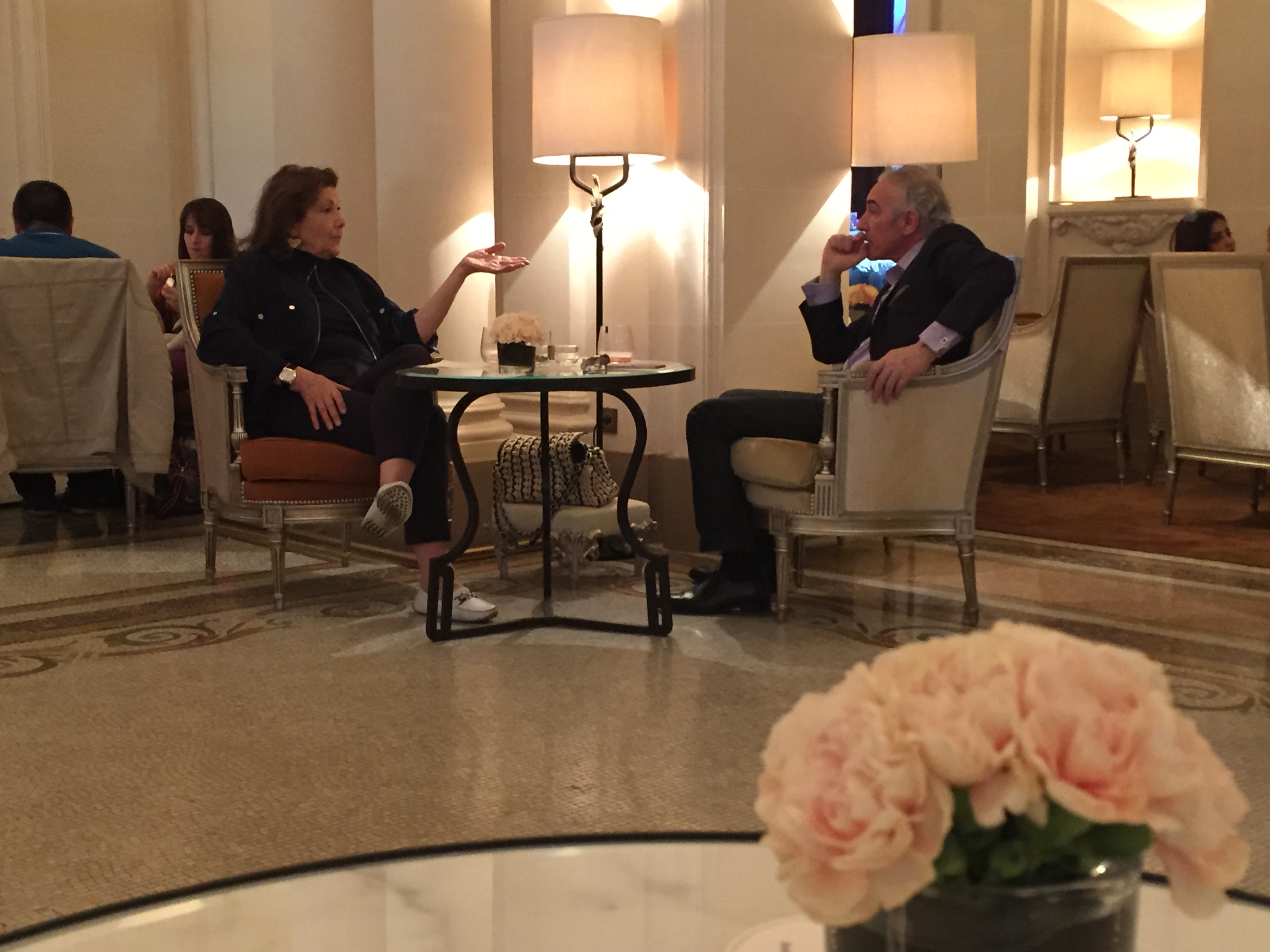 Des clients très chics prennent un verre dans la galerie de l’hôtel Plaza Athénée, avenue Montaigne. L’hôtel qui a ouvert ses portes en 1913 est toujours un lieu à la mode pour les gens riches et célèbres. Juin 2015.