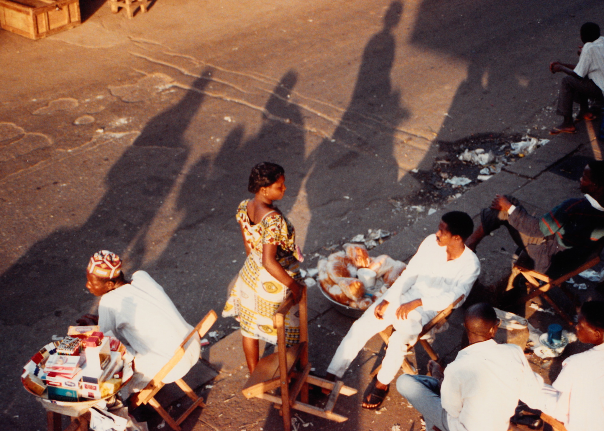 This evening falls on Martin Street in Lagos island. Street vendors offer local currency exchange at the black market rate. March 1991.