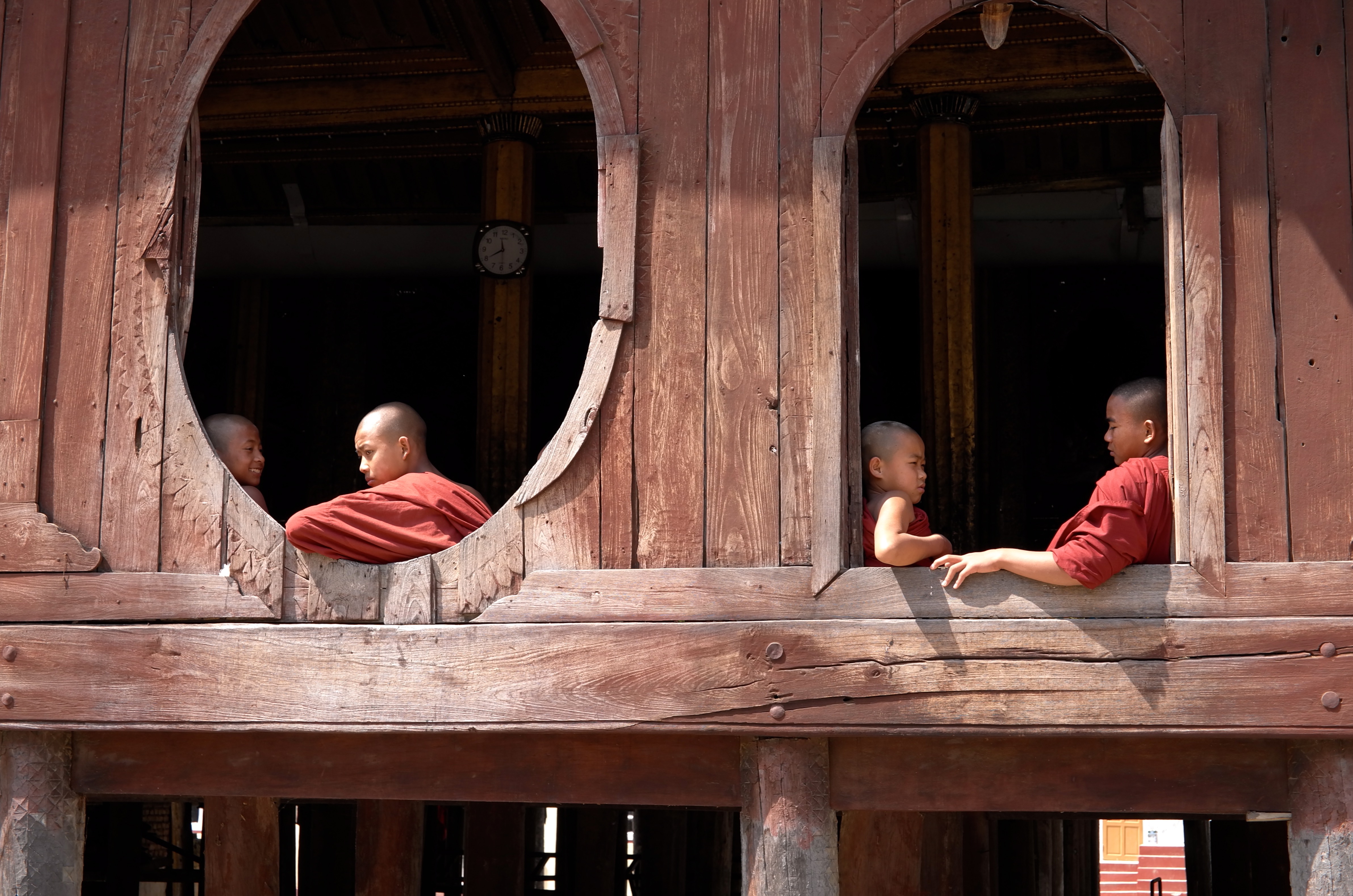 C’est une journée chaude et ensoleillée au monastère Shwe Yan Pyay. De jeunes moines prennent une courte pause au soleil avant de retourner à leurs études bouddhiques. Février 2015.