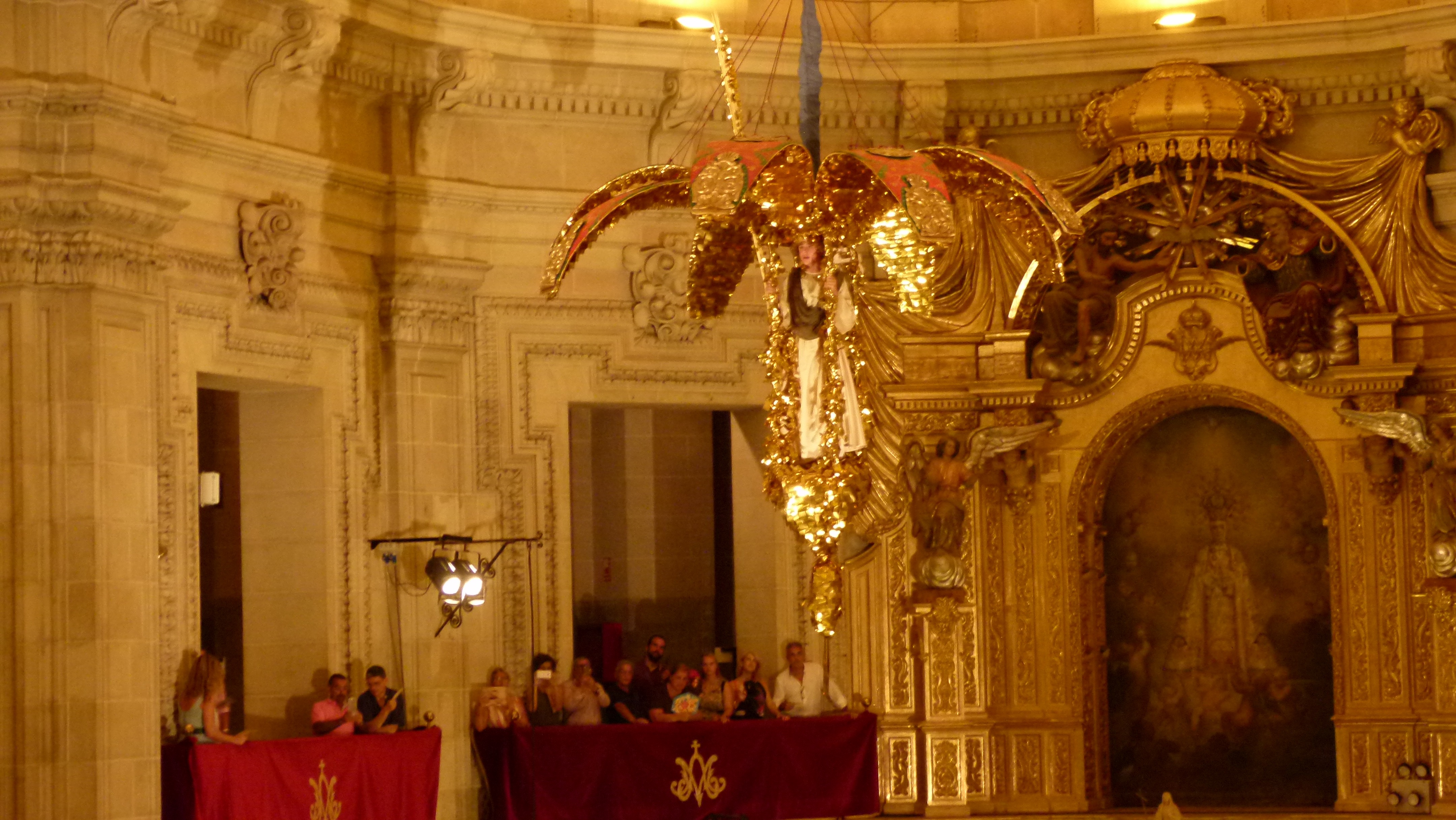 Dans la première partie du Mystère d’Elche, l’ange descend en chantant du toit de la Basilique en portant une palme dorée. Le Mystère d’Elche est une représentation liturgique théâtrale que l’on donne chaque année depuis le Moyen Âge les 14 et 15 août dans la Basílica de Santa Maria. En 2001, l’UNESCO l’a déclaré comme patrimoine culturel immatériel de l’humanité. Il commémore la Dormition, l’Assomption et le Couronnement de la Vierge Marie. Août 2015.
