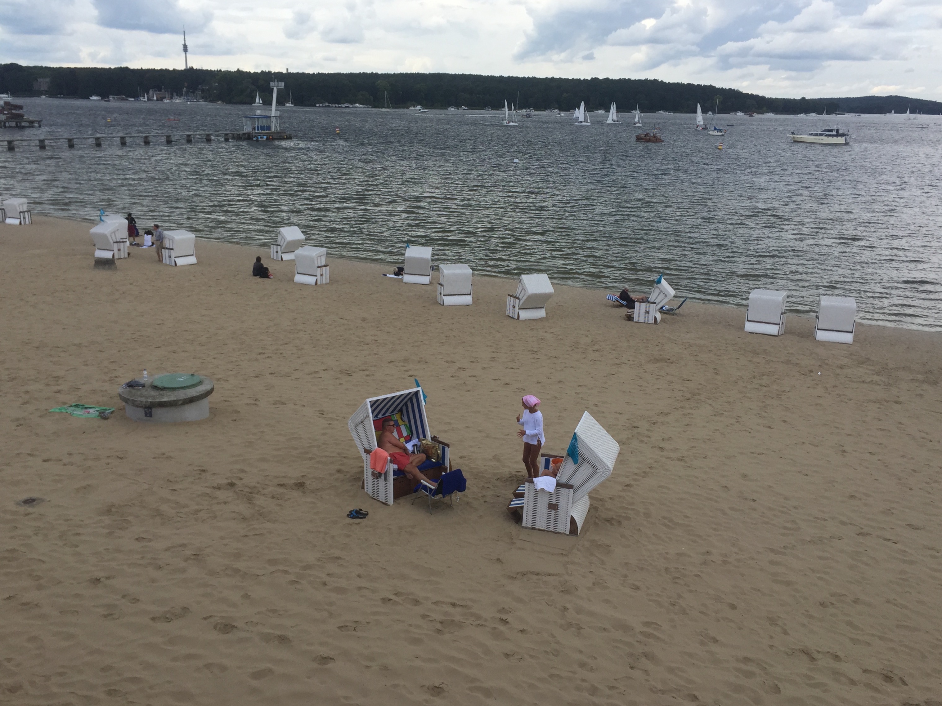 The Wannsee lake is situated in the southwest of Berlin and is one of the most popular recreation spots in the city. People relax in roofed wicker beach chairs while the storm is slowly approaching. September 2015.