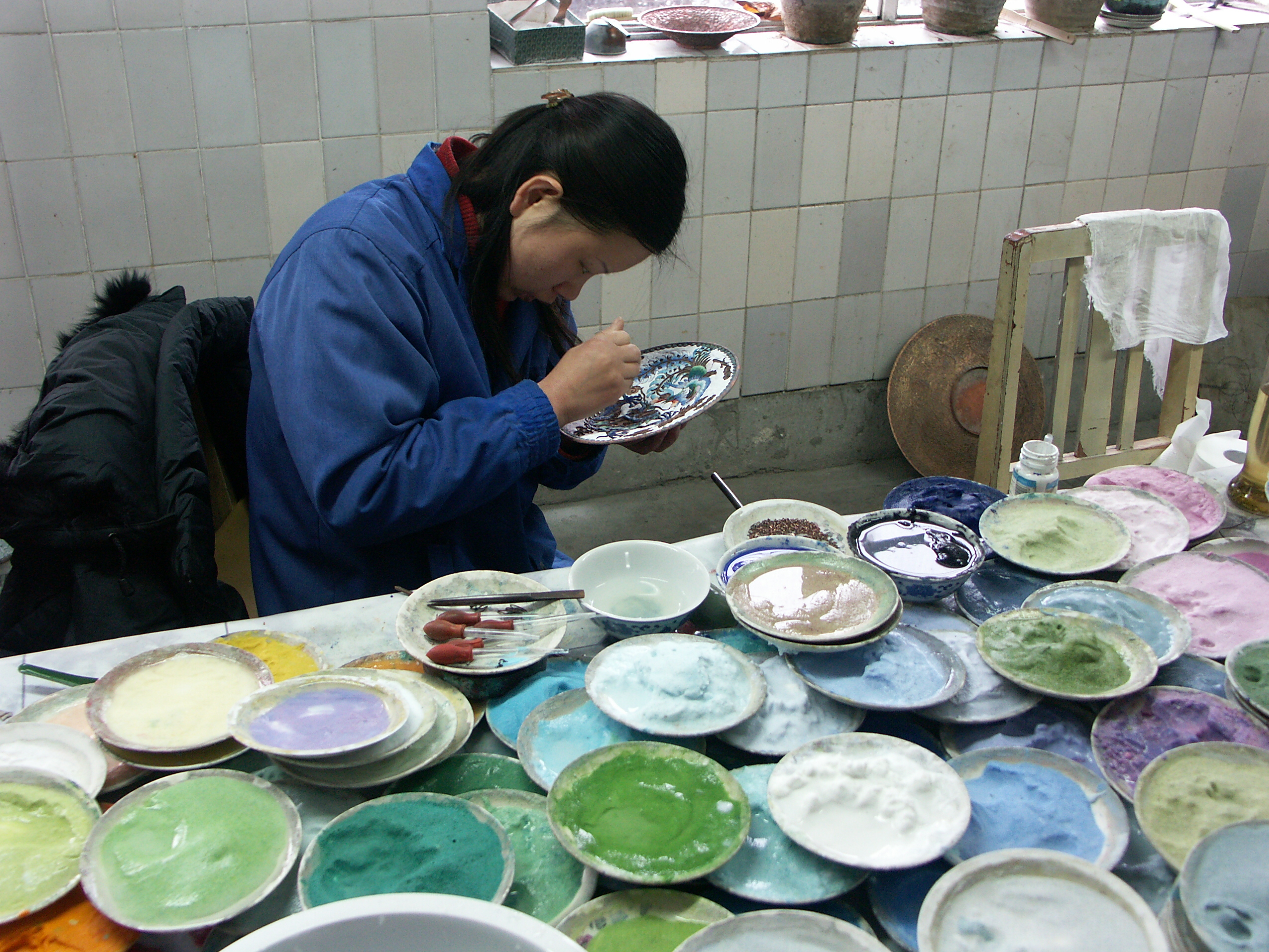 This ceramic worker is showing her technique in a plant near Beijing. She is part of tourist trap that leads foreign visitors to a large store. December 2004.