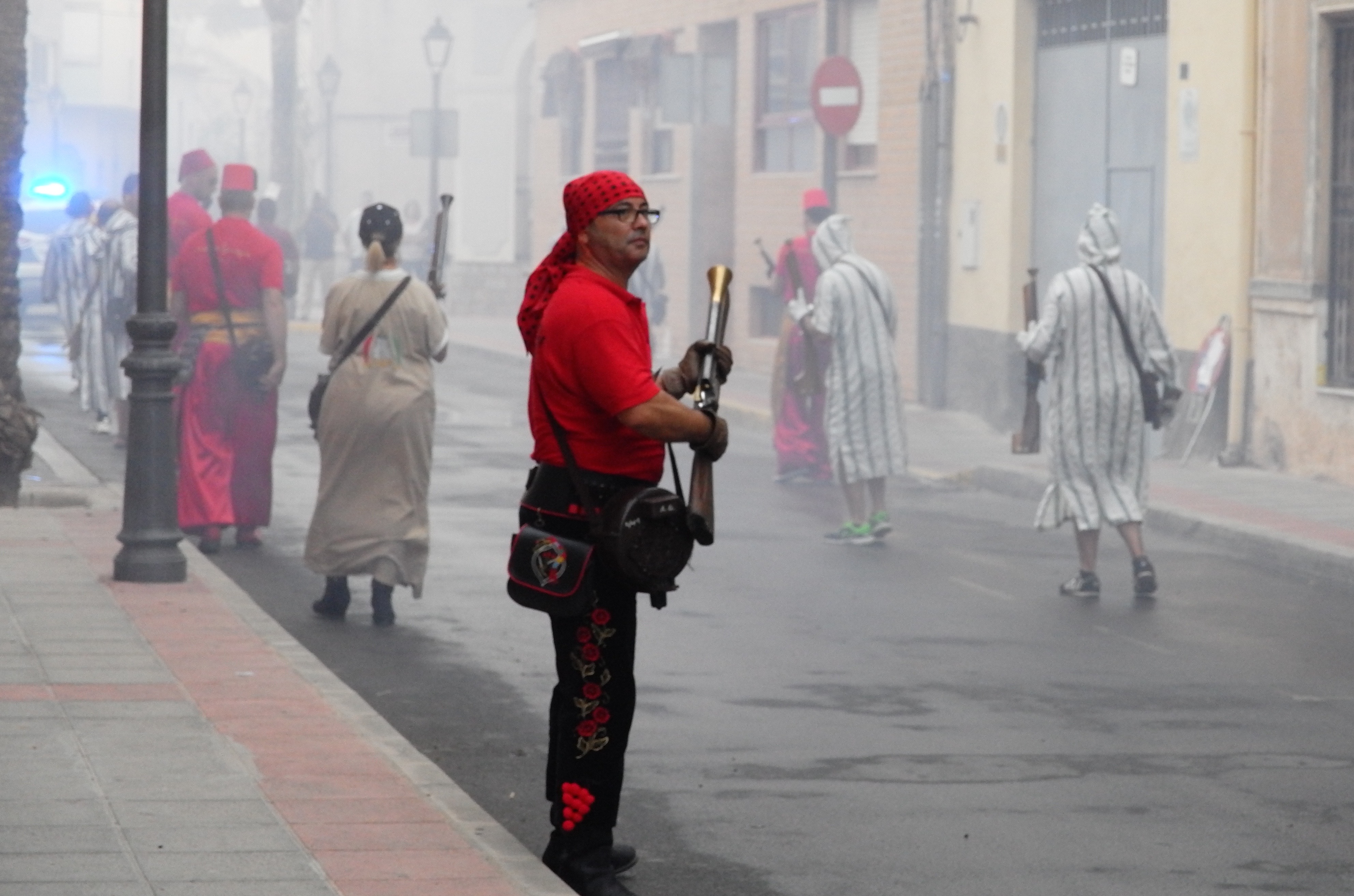 The annual festival of Moros y Cristianos in Aspe celebrates the Reconquista (« reconquest ») of Spain and the past fights between Muslim and Christian populations. On the last evening, the group representing the Christians takes over the city with loud arquebus shots. August 2015.