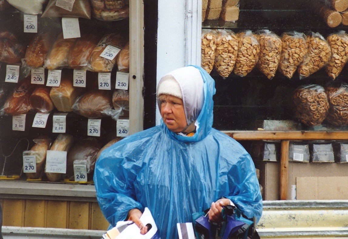 In the years that followed the fall of USSR, many old people, mostly women, were left with very little revenues. This women was one of them. In order to survive, she was selling plastic bags on the Haymarket square in Saint Petersburg. May 1998.