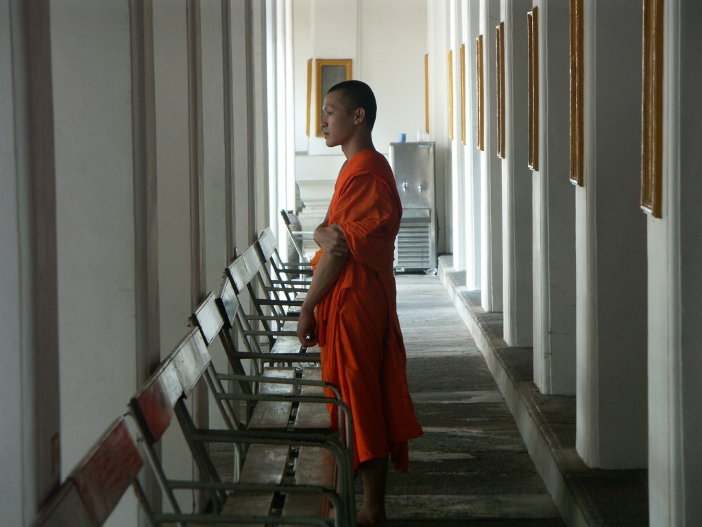 A young monk student is waiting for the ferry boat that will takes him up the chao phraya river. March 2007.
