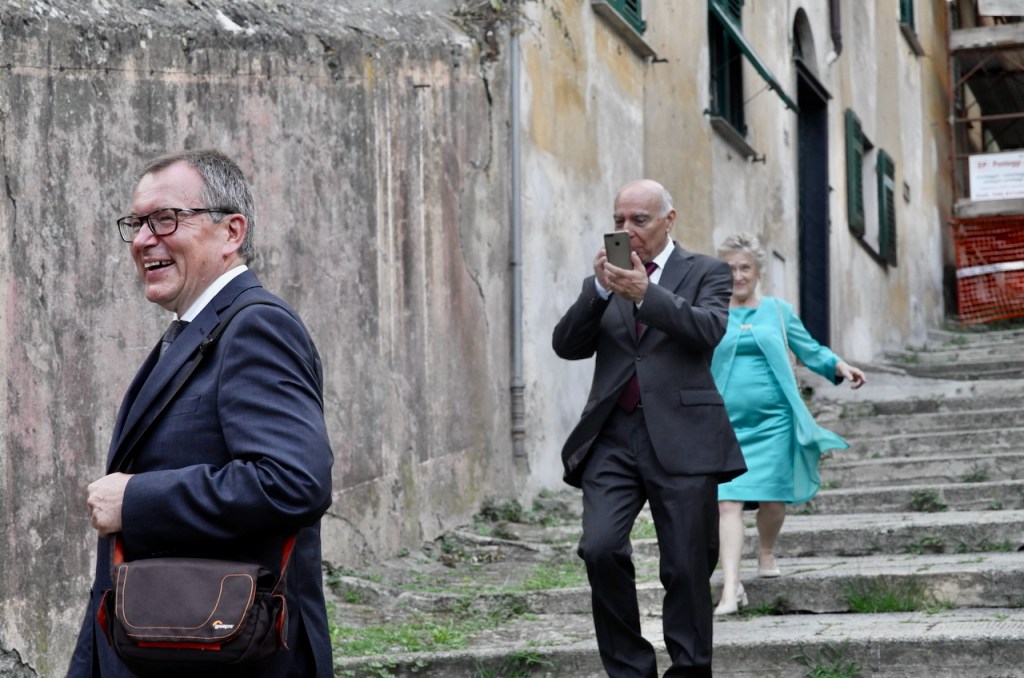 Some guests go down the stairs after attending the wedding ceremony. August 2020.
