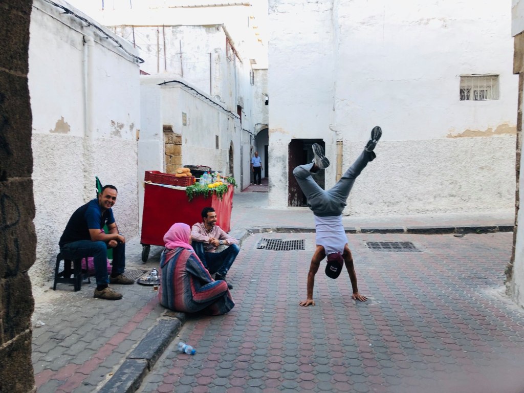 Dans le joli quartier des Habous, un homme fait un spectacle for un marchand ambulant et quelques clients. Juin 2019.