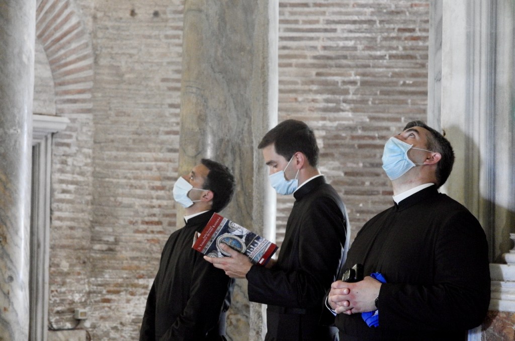 A group of priests is enraptured by the beauty of the Byzantine mosaics of the basilica of San Vitale. August 2020.