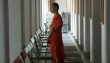 A young monk student is waiting for the ferry boat that will takes him up the chao phraya river. March 2007. Un jeune moine étudiant attend le ferry qui l’emmènera sur le fleuve Chao Phraya. Mars 2007.