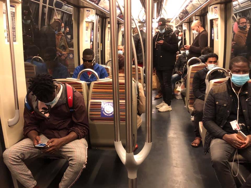 Après le premier confinement en raison de la pandémie de covid, les Parisiens prennent le métro pour aller au travail. Ils doivent tous porter des masques. Mai 2020.