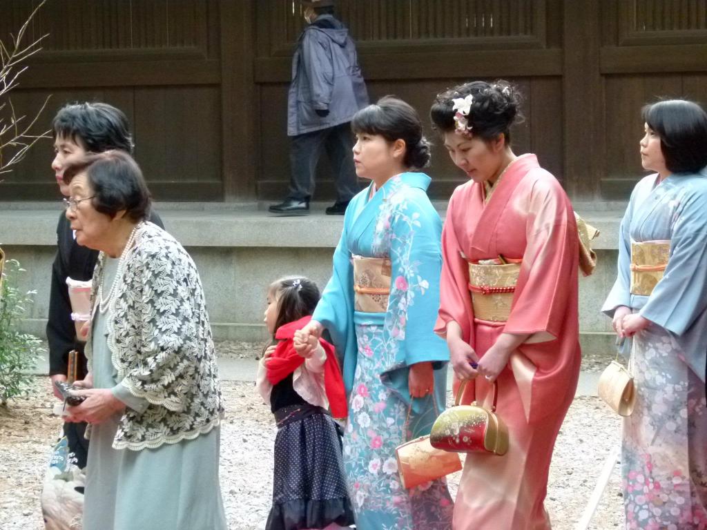 A group of ladies is about to join a wedding ceremony at the Meiji shrine, a shinto shrine in the Shibuya district. February 2012.