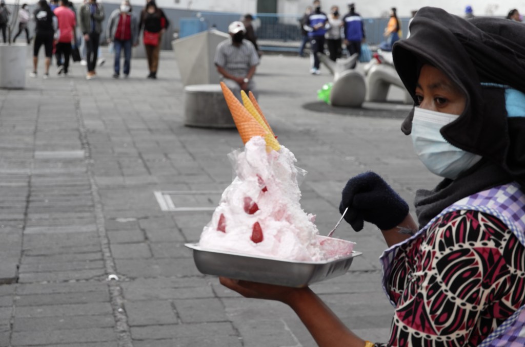 In the streets of the old city of Quito, you can buy this strange thing that looks like ice cream that does not melt. It is called ‘espumillas’ (foam) and is made from egg whites, fruit pulp, and sugar. August 2021.