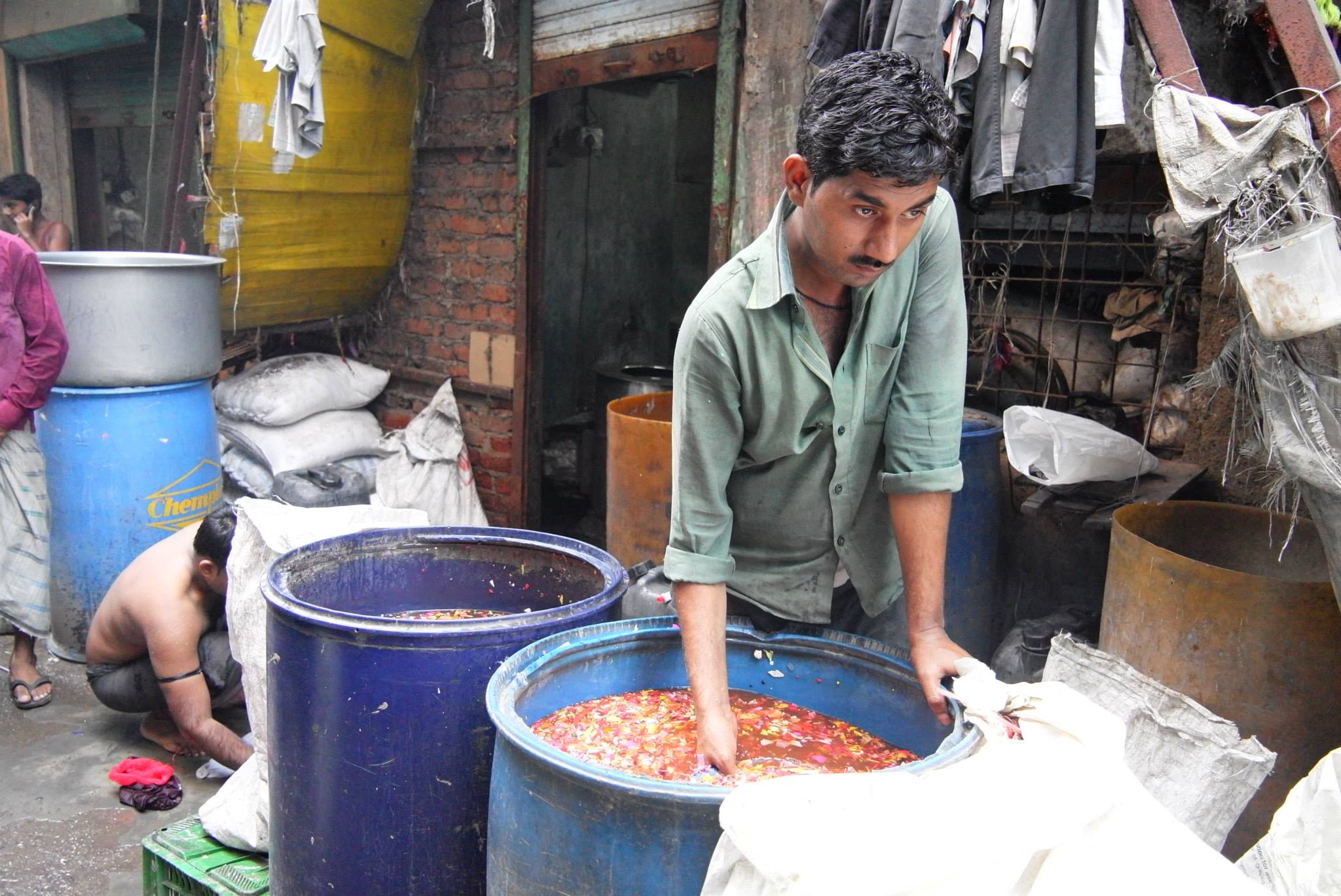 Le recyclage du plastique est un des métiers du bidonville de Dharavi. Le plastique est trié, déchiqueté puis lavé dans des cuves pour éliminer les impuretés. Mai 2015.