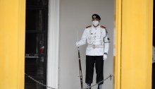 A guard stands still outside an official building in Guayaquil. August 2021. Un garde se tient immobile devant l’entrée d’un bâtiment officiel de Guayaquil. Août 2021.