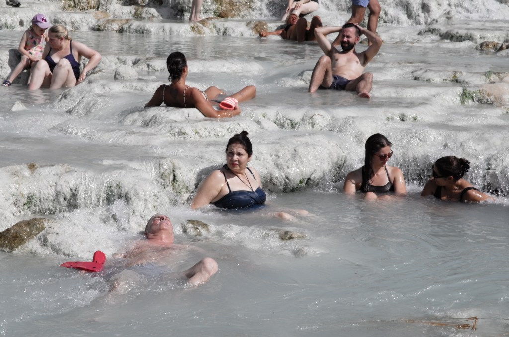 The main thermal waterfalls in Saturnia are the mill falls. The sulphurous spring water is at a temperature of around 99.5 °F. It is a popular spot for families who can access the place for free. August 2022.