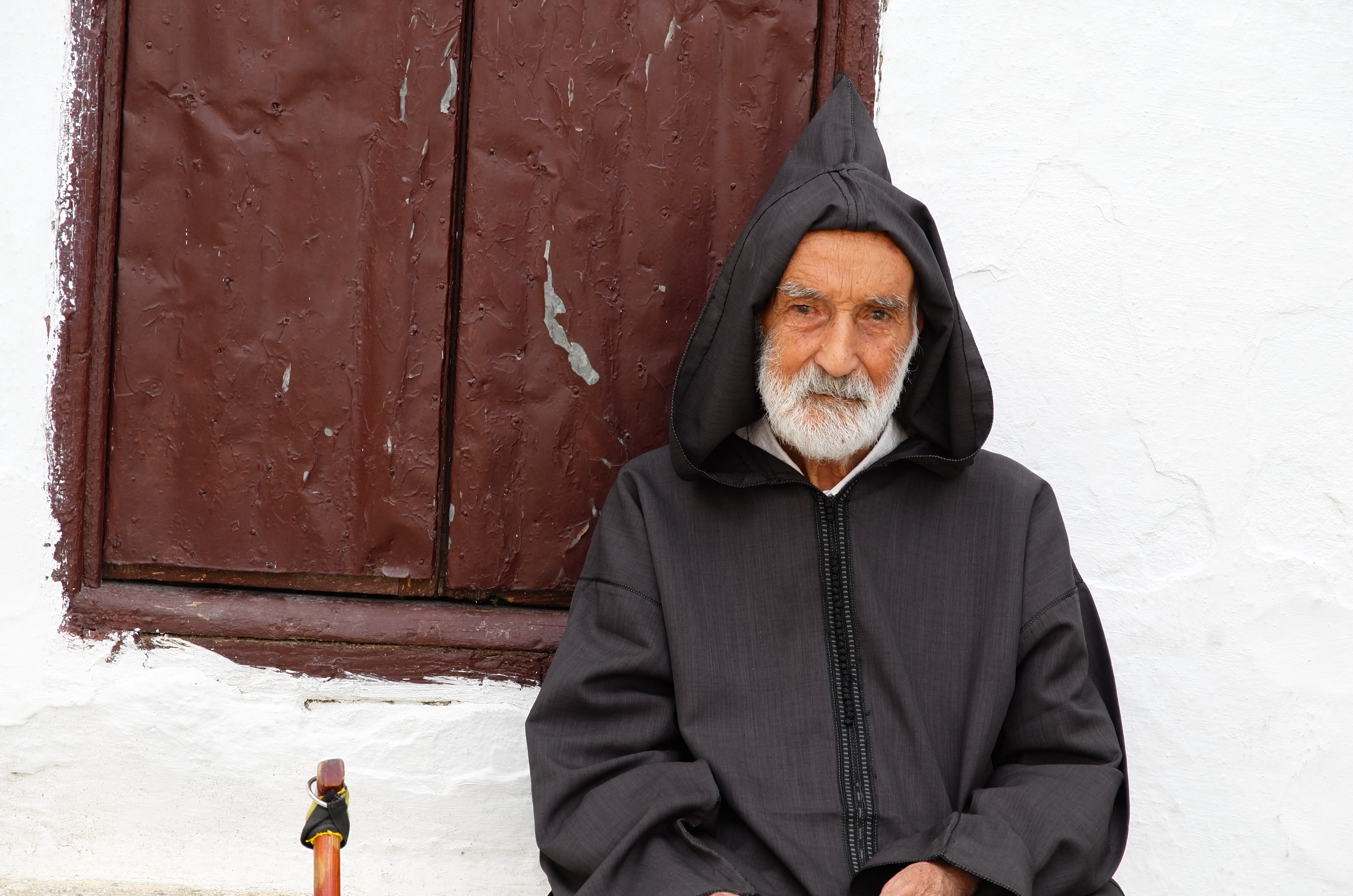 An old man sits outside a mosque in the town of Moulay Driss Zerhoun. The town is known for being the site of the tomb of Idriss I, the first major ruler of Morocco and it attracts a lot of pilgrims every day. October 2022.