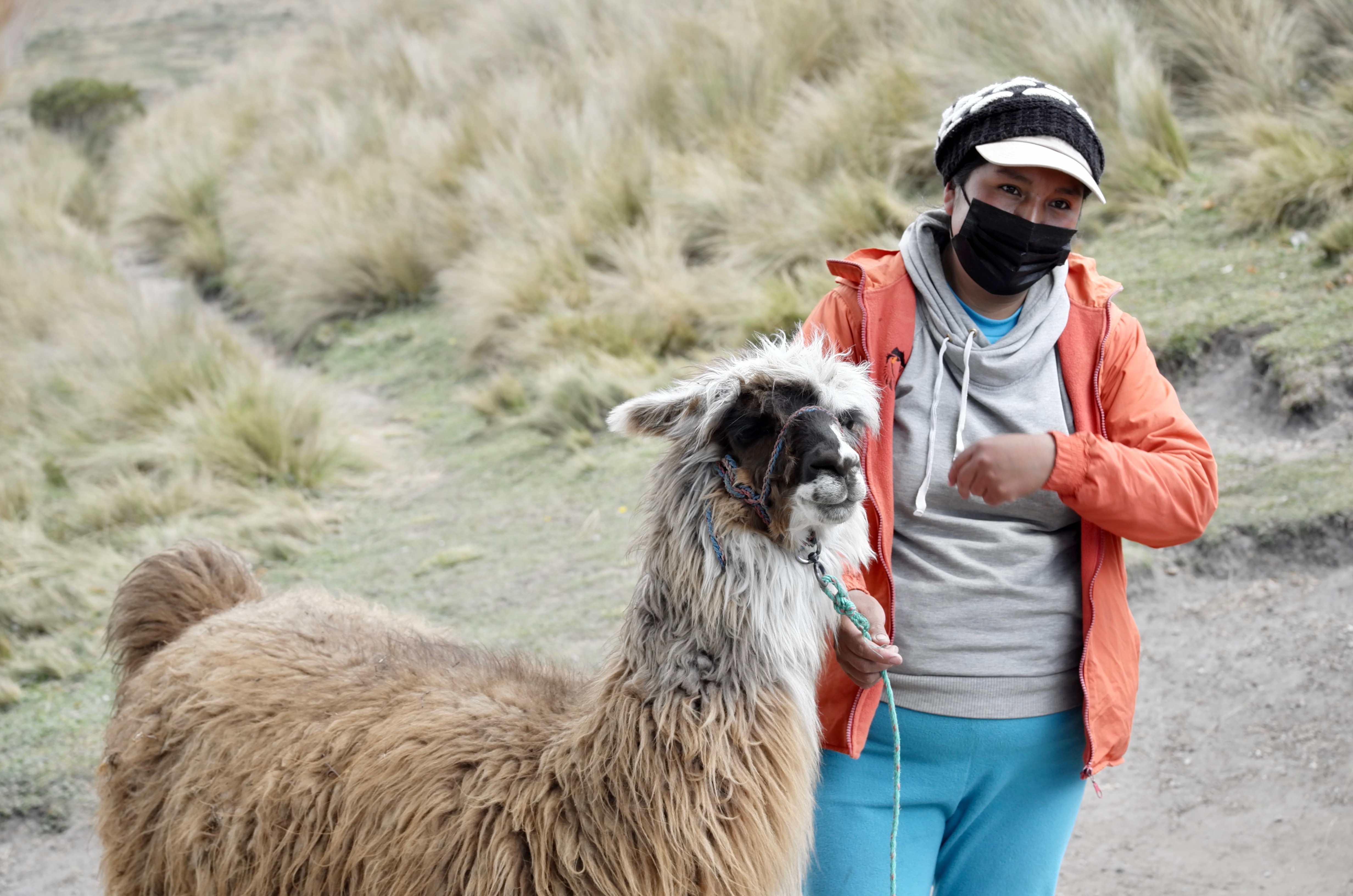 At 13,123 feet above sea level, Pichincha volcano dominates the city of Quito. At the top, a woman is proud to show her vicuna. August 2021.