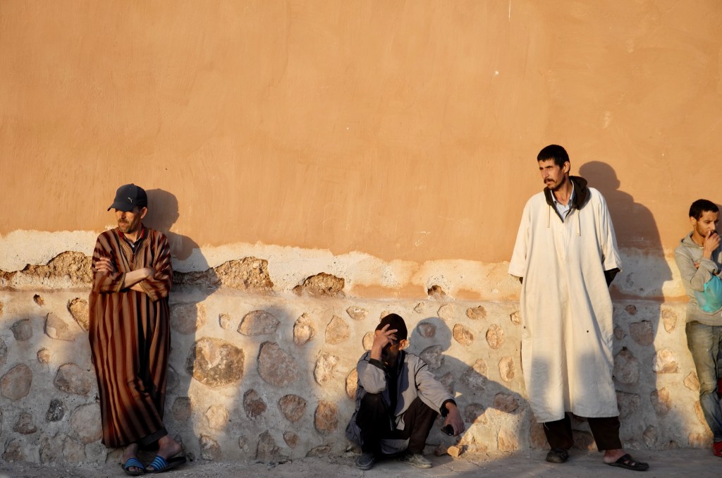 While the sun is going down, a group of men listen to musicians outside the Tiznit walls. They patiently wait for the night in order to break the Ramadan fast. April 2022.