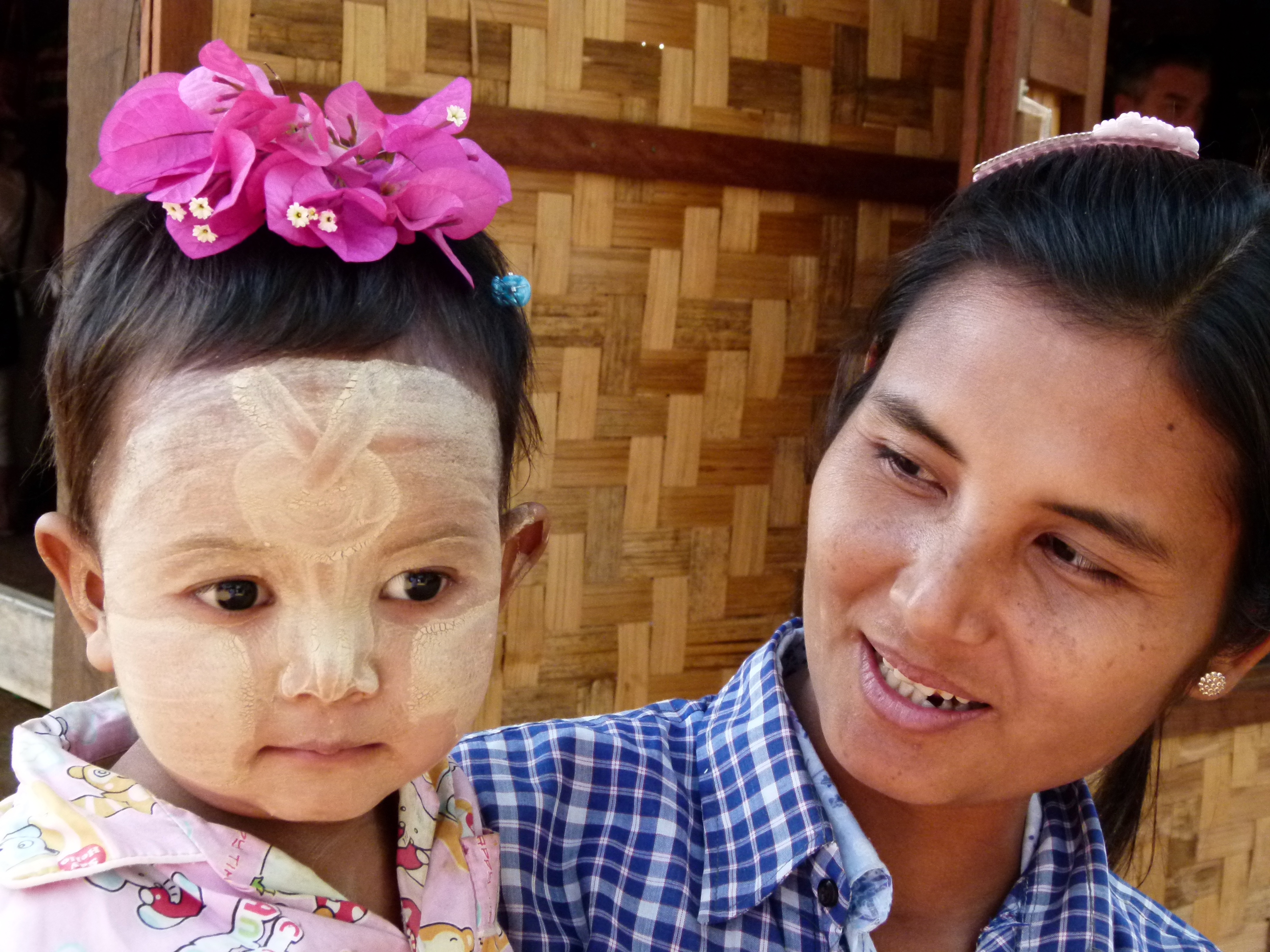 Une femme a couvert le visage de sa fille avec du thanaka – une pâte cosmétique naturelle à base d’écorce moulue – afin de la protéger de la dureté des rayons du soleil. Février 2015.