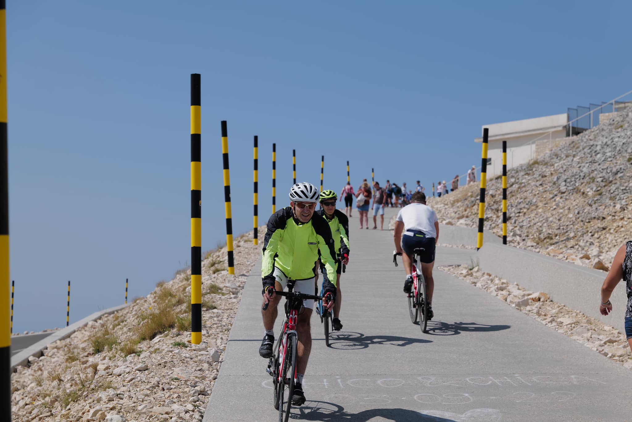 Mont Ventoux is a mountain that has gained fame through its inclusion in the Tour de France cycling race. Lots of cyclists enjoy climbing up to the peak. July 2023.
