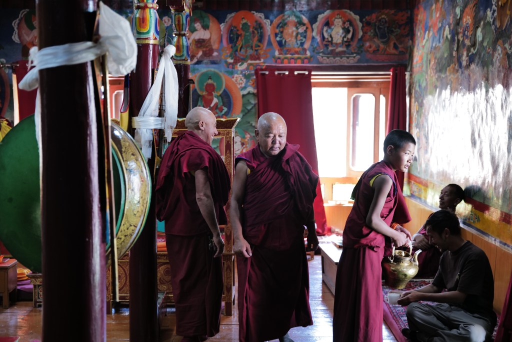 C’est la fin de la prière du matin au monastère de Likir au Ladakh. Les moines bouddhistes commencent à quitter la salle. Août 2023.