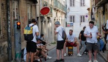 A group of young tourists is having beers in one of the narrow streets of the Bairro Alto (the Upper District). The neighborhood attracts foreign visitors and fado lovers. July 2023. Un groupe de jeunes touristes boit des bières dans l’une des rues étroites du Bairro Alto (le Quartier Haut). L’arrondissement attire les visiteurs étrangers…