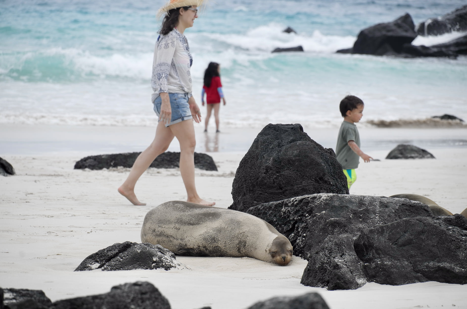 Hautes vagues, sable blanc, otaries. Des familles se baladent dans l’environnement improbable de la plage de Puerto Chino, sur l’île de San Cristobal. Août 2021.
