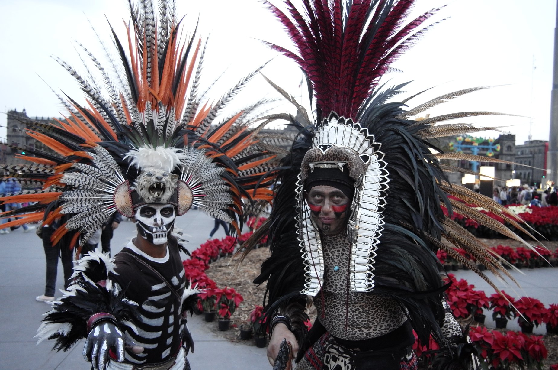 Des danseurs mexicains en costumes aztèques sont sur la place de la Constitution, plus connue sous le nom de Zocalo. Leurs tenues incluent de longues plumes. Décembre 2018.