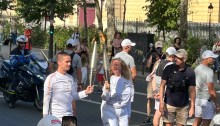 Two Olympic torchbearers hand over the flame in front of the Cirque d’Hiver. It is the opening day of the Paralympic Games. August 2024. Deux porteurs de la flamme olympique se passent le relais devant le Cirque d’Hiver. Nous sommes le jour de l’ouverture des jeux paralympiques. Août 2024.
