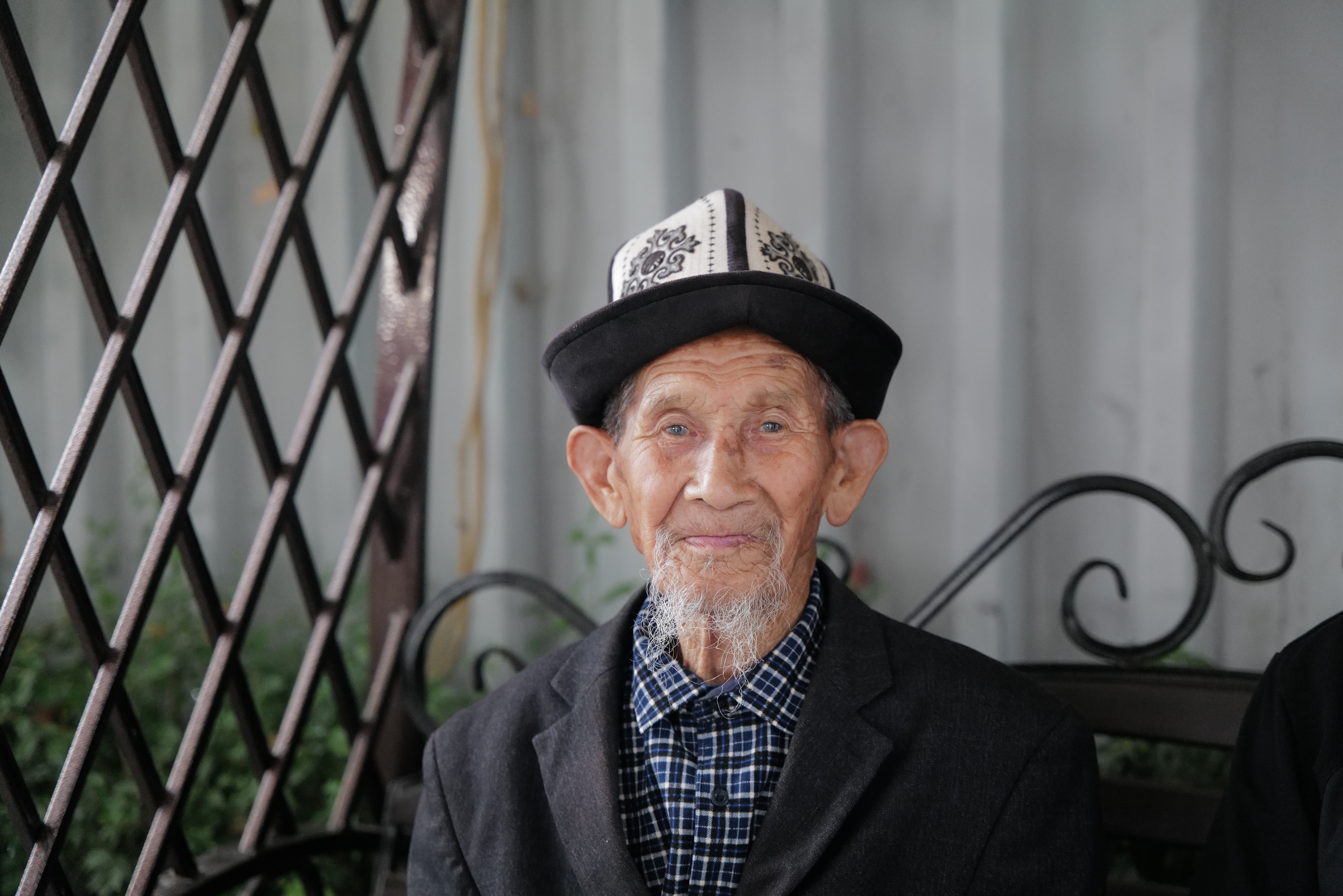 An old man is sitting outside a restaurant in Cholpon-Ata, the holiday town on the shores of lake Issyk-Kul. He is wearing a kalpak, the traditional Kyrgyz felt hat. It is forbidden to offer or sell one’s kalpak, which must be passed down from father to son. August 2024.