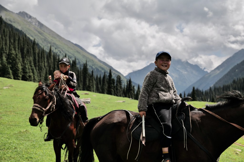 Dans les montagnes près de Karakol, les enfants kirghizes apprennent très jeunes à monter à cheval. Sans être accompagnés par des adultes, ils se déplacent sur le plateau d’Altyn Arashan, connu pour ses sources thermales. Août 2024.