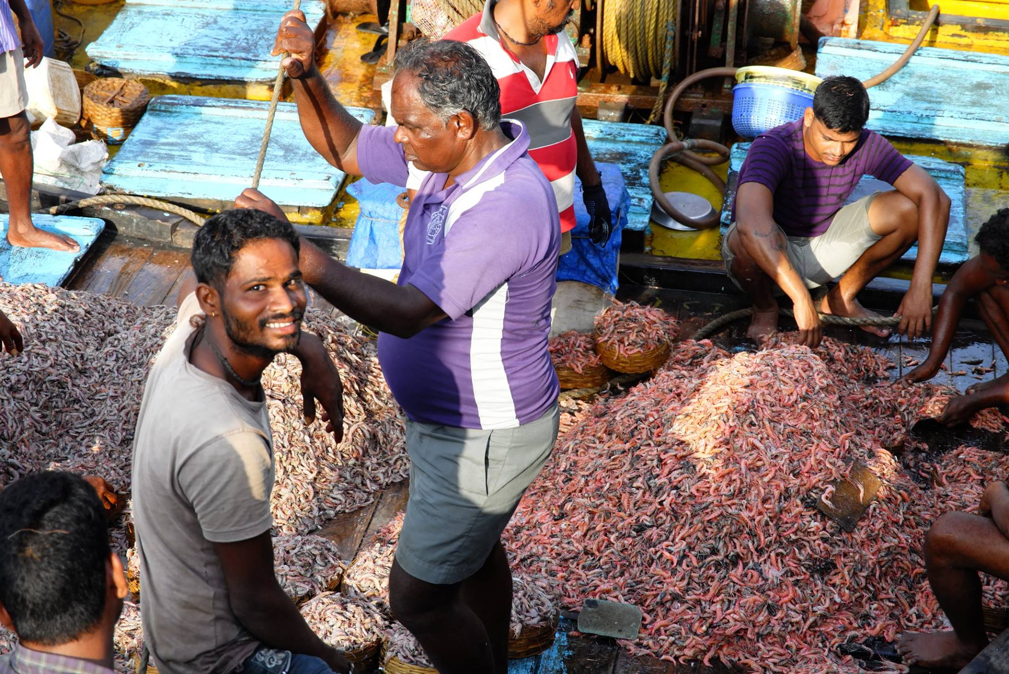 Tens of kilos of shrimp were unloaded at the Sassoon Docks quay. Young people are getting ready to sort them so that they can be distributed throughout the Colaba neighborhood. May 2015.