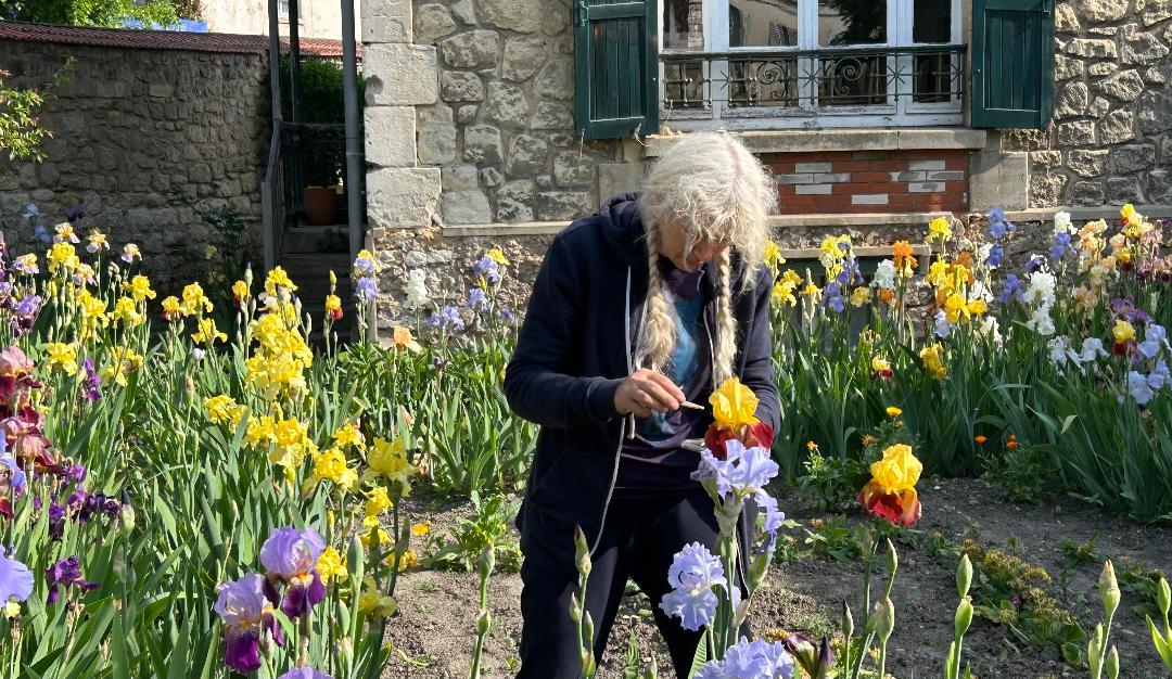 C’est la saison des iris à Anvers-sur-Oise où est mort en 1890 le peintre Vincent Van Gogh, qui a aussi été inspiré par cette fleur. Dans un jardin, une dame collecte les pistils avec une petite pince pour les polliniser. Mai 2025.