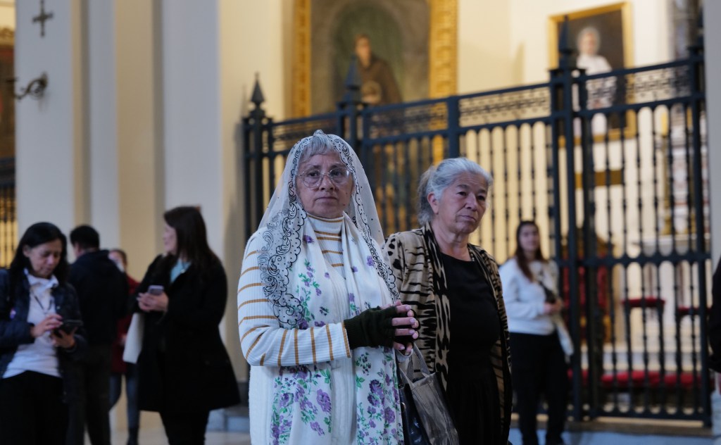 The Sunday Mass has just ended. Two parishioners are leaving the Cathedral of Our Lady of the Assumption in Bogotá. August 2025.