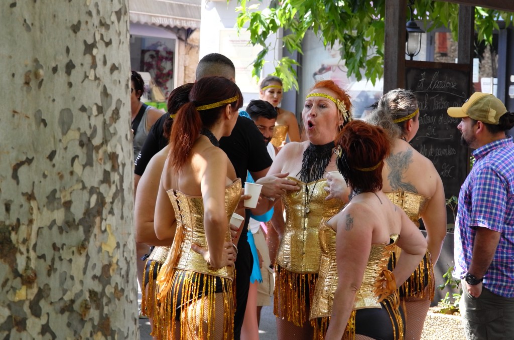 The Bastille Day parade has just ended. In Prades, this is called a “passe ville.” The majorettes from the Pays d’Olmes had a drink before heading home. July 2025.